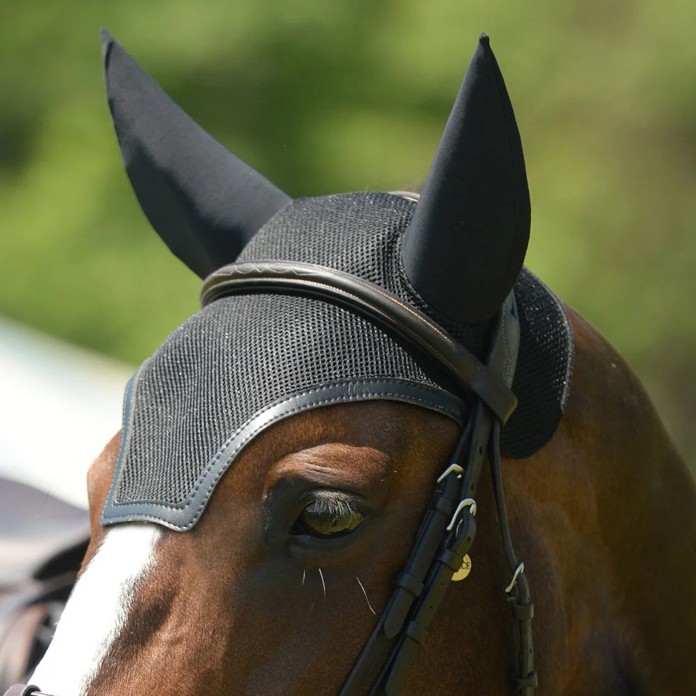 The EquiFit SilentFit Ear Bonnet is made with a multi-dimensional air-mesh design that has been engineered to keep the horse’s head cool and dry. The modern contoured shape and the Everleather trim keeps you looking your best in the ring. This bonnet is beautifully crafted for the show ring or schooling at home. The spandex mesh ears are lined with antimicrobial, non-neoprene, sound inhibiting foam to help your horse maintain focus.